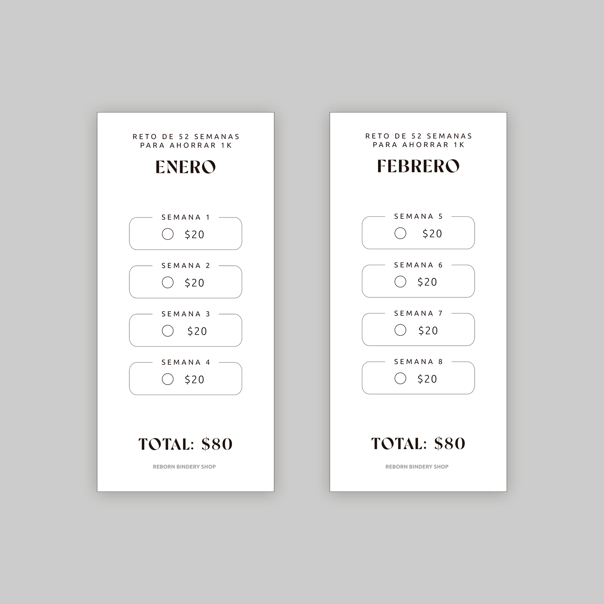 - 12 retos por cada mes con 4 cantidades diferentes para ahorrar